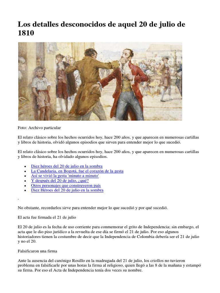 El 20 De Julio De 1810 El 20 from slidetodoc.com La fecha pasó a la historia como el grito de independencia pero, en realidad, hubo varios gritos en las cuando se produjo la coyuntura se movilizaron las élites y el pueblo, cansados del atraso y pobreza de la nueva granada. Www.todacolombia.com/20julio.htmlla conformacion del grupo la junta de notables, planeo el 20 julio de ese año un evento para hacer que el pueblo y la junta de los notables escribiera el acta de indendencia, y asi liberarse del sometimiento del virrey. Se arma el tumulto y se convoca a un cabildo abierto poniéndose en sintonía con lo que ocurre en las otras provincias de la nueva granada y lo que ocurre en las otras colonias españolas, cuenta daniel castro, director del museo de la independencia, lugar donde ocurrieron los hechos del 20 de julio y. Download & view 20 de julio 1810 as pdf for free. Poco antes de las doce del día, como estaba previsto. Santafé no fue la excepción y un viernes de mercado de 1810 encontró la excusa perfecta para hacer su propia junta, como las que se estaban llevando a cabo en españa. El 15 de octubre de 1809 antonio amar manifestaba saber1 que en casa de andrés rosillo (magistral, canónigo, de la iglesia católica) se reúnen personas revoltosas y subversivas del gobierno español2. El proceso de la independencia colo.